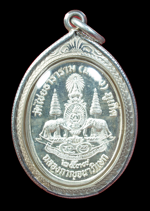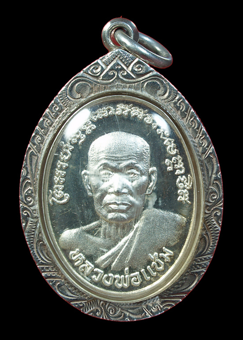 เหรียญหลวงพ่อแช่ม วัดฉลอง จ.ภูเก็ต ปี 39 เนื้อเงินพ่นทราย เลี่ยมเงิน